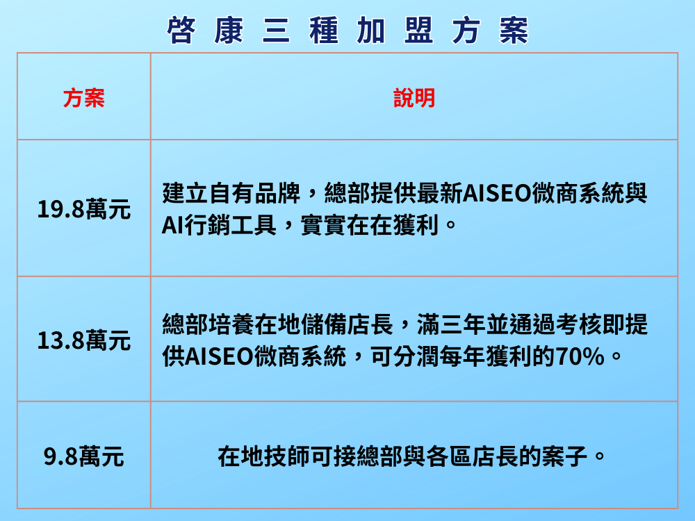 創業加盟可分36期0利率,請留下姓名與手機號碼我們會儘快與您聯繫,謝謝 ! 也請先加入啟康官方帳號 @iwash,直接留言詢問喔 ! 本頁下方有更詳細的電子書,歡迎觀看!